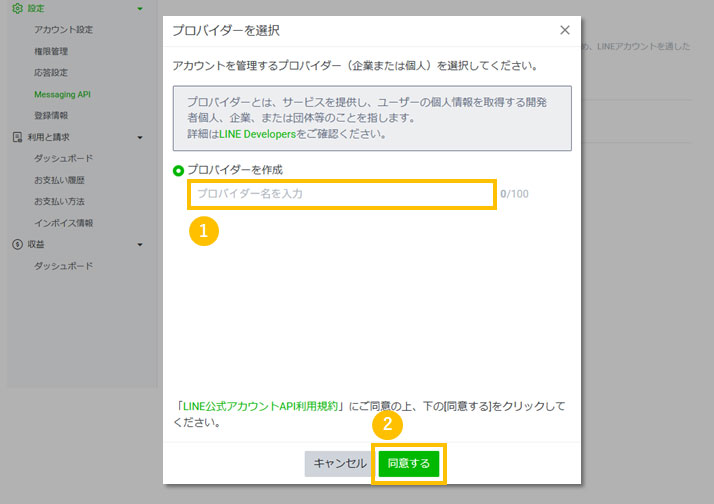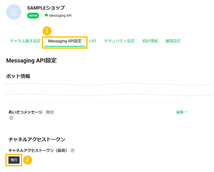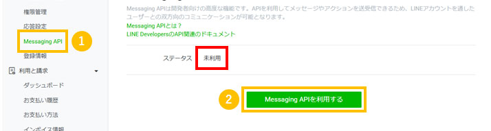 - 1上部のメニュータブから「Messaging API設定」をクリック