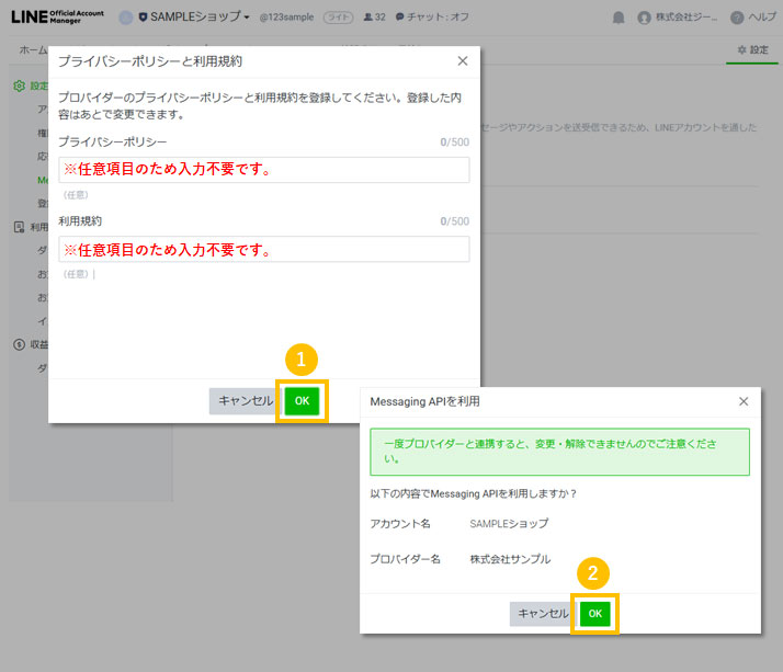 - 1続いて表示される「プライバシーポリシーと利用規約」は未入力のまま「OK」をクリック