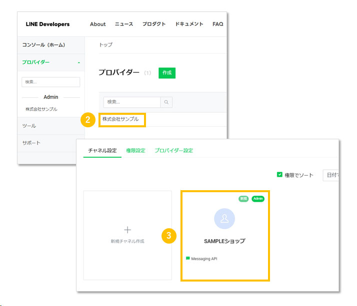 - 3チャネル設定一覧から「Messaging API」のチャネルをクリック