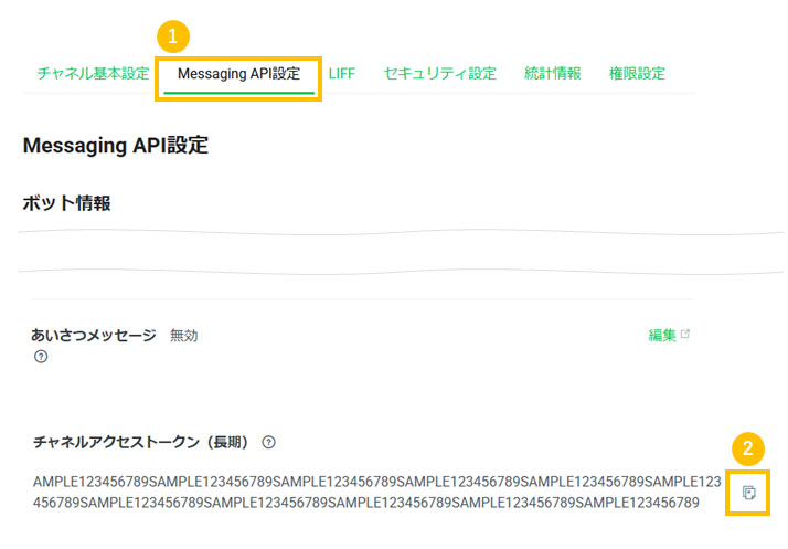 - 2ページ下部のチャネルアクセストークン(長期)の文字列横の「コピーアイコン」をクリック