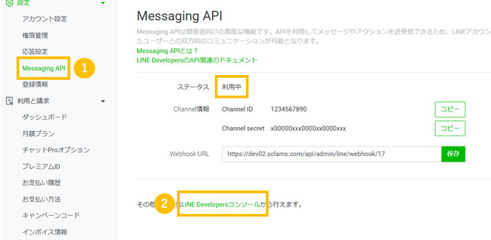 LINE公式アカウントをSCLAMSの管理画面で操作するために必要な利用情報の確認手順です。