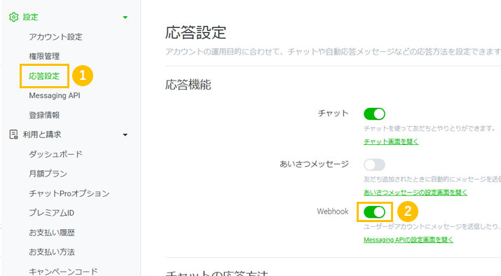 - 1サイドメニューの「応答設定」をクリック