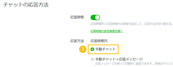 - 3その下の「チャットの応答方法」d「手動チャット」を選択