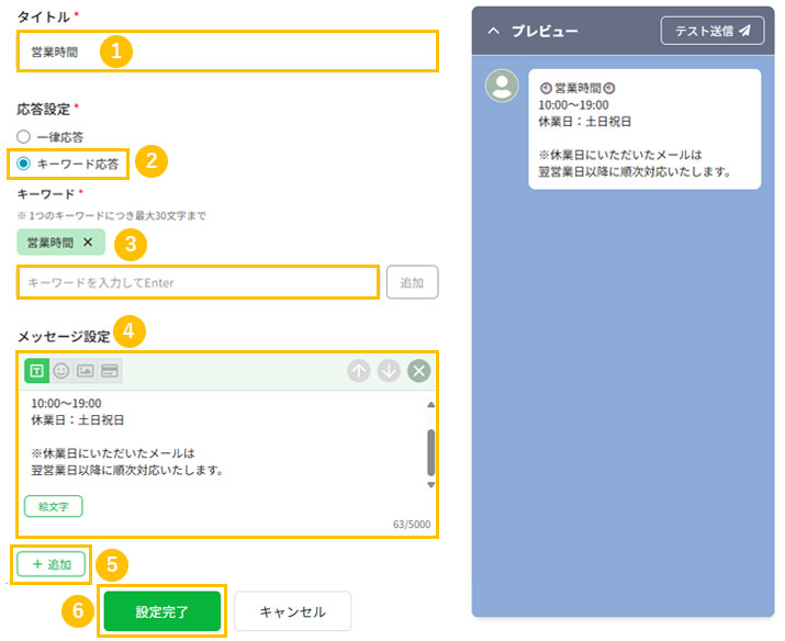 ※入力欄上部に緑枠でキーワードが表示されればOK - 4「メッセージ設定」で返信するメッセージを入力