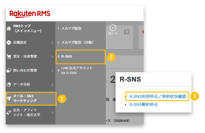 - 1RMSトップから「メール・SNS マーケティング」をクリック