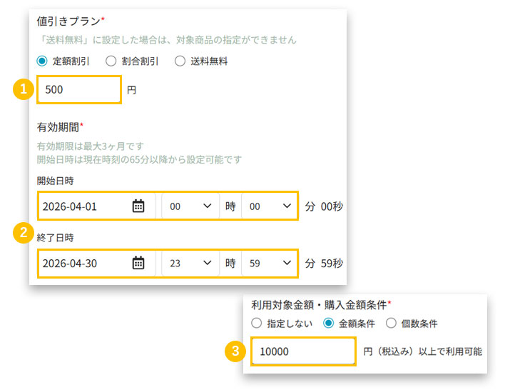 3. 3利用対象金額・購入金額条件で「金額条件」を選択し金額を入力