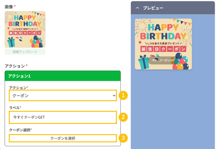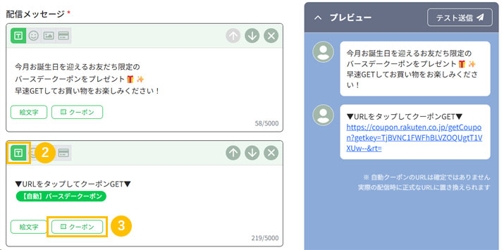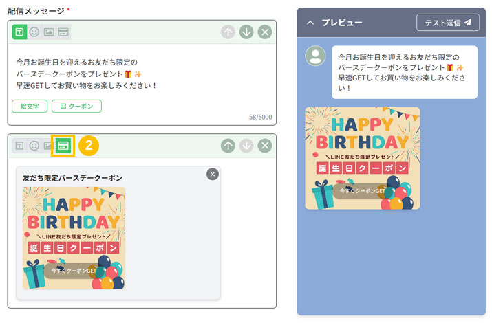 2. 2カードタイプメッセージのアイコンをクリックし、バースデークーポンを選択