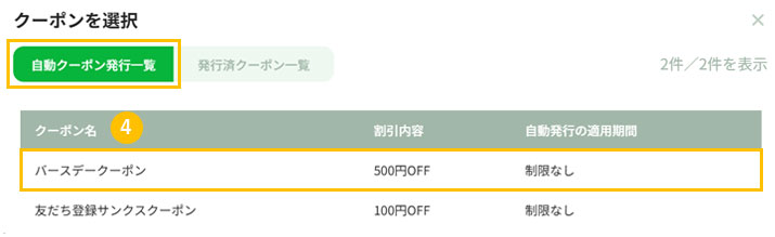 4. 4自動クーポン発行一覧」から作成した自動発行設定を選択